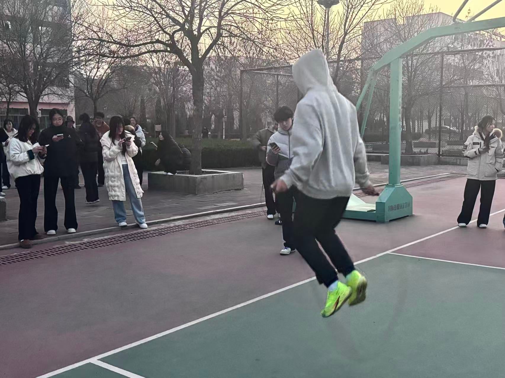 本次比赛未设繁复布置,篮球架为背景、地砖为赛道,简易的赛场却挡不住经管人的热情。随着比赛开始,参赛选手们迅速切换状态,厚羽绒服裹不住跃动的身姿,手中跳绳飞速轮转,带起阵阵劲风。脚下步伐似装了弹簧般轻快,绳拍地面的脆响与围观者的计数声、呐喊声交织,汇成热闹的赛场交响曲。负责计数的同学紧盯手机屏幕,指尖随跳绳节奏不停轻点,哈出的白气在冷空气中氤氲,尽显专注与负责。